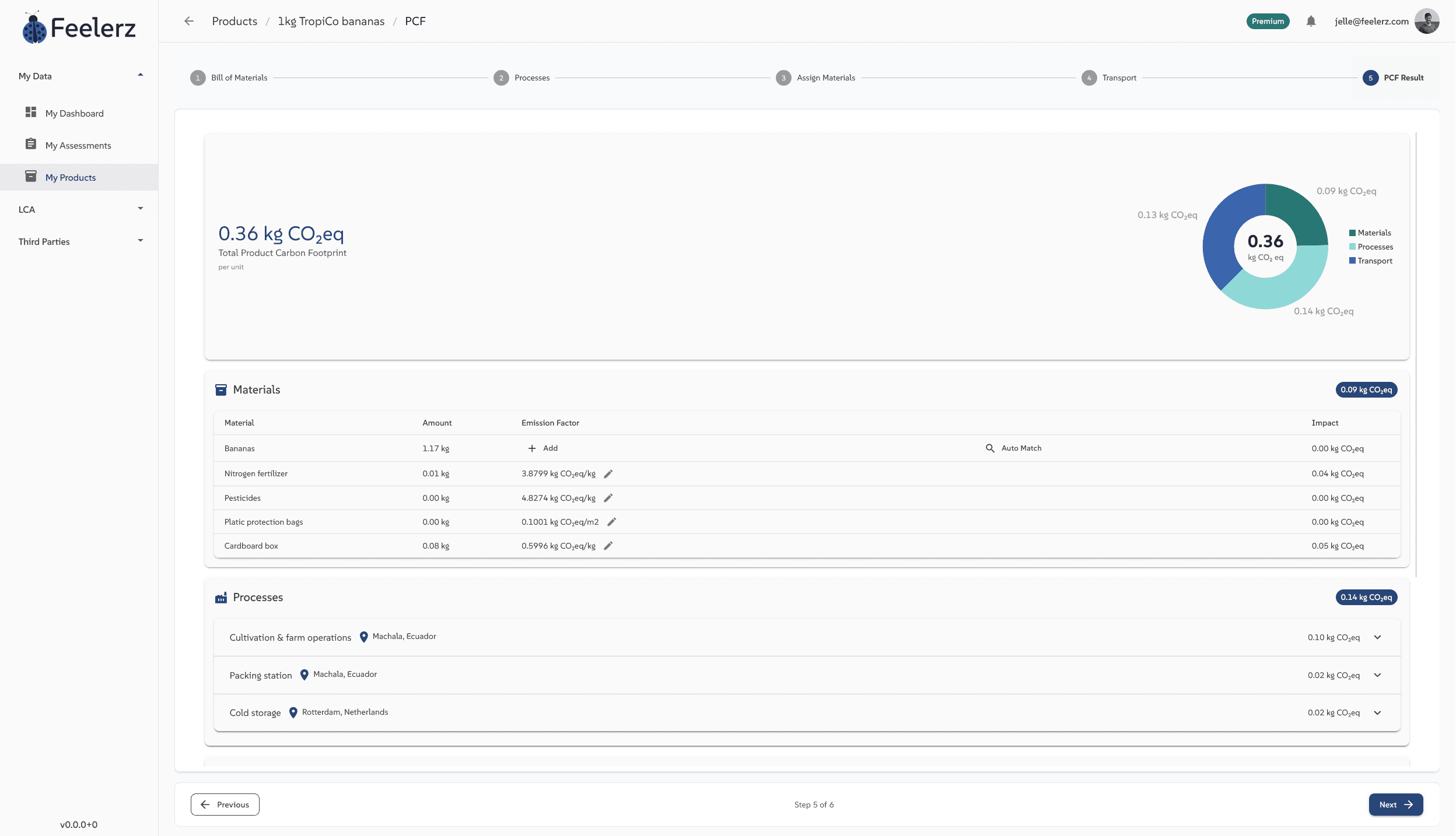 After filling in these four steps our system will find our extensive database and find the most suitable emission factors in order to calculate and accurate estimation of the impact of your product disaggregated in raw materials, process and transportation.